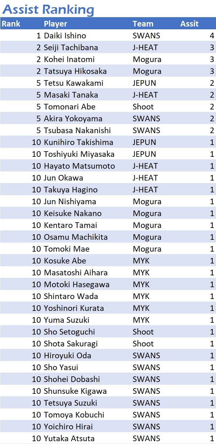 試合日程・結果 第10節 2022年10月29日(土)~11月6日(日) 2022年10月29日(土)~11月6日(日) Match Results Leader Board Scorers/Assisters S...
